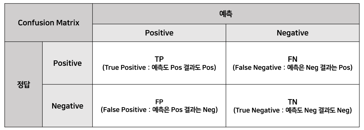 - 이진 분류에서 예측 오류가 얼마인지, 어떠한 종류의 오류가 발생하고 있는지 나타내주는 행렬
