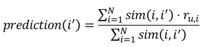 - 아이템간 유사도 값을 가중치로 사용하여 평점 추론
