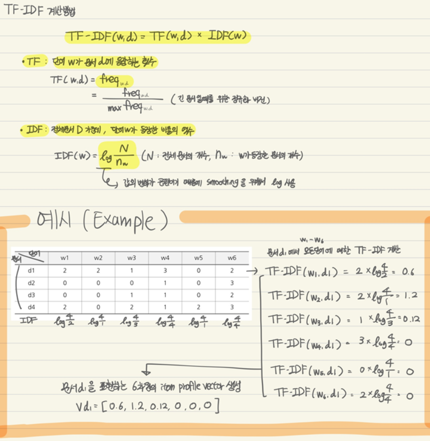 - 단어 w가 전체 문서 D에서는 적게 등장 (IDF, Inverse Document, Frequency)