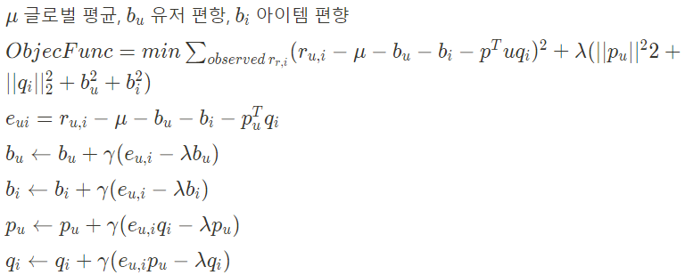 - Adding Biases: 유저/아이템의 편향을 반영 → 전체 평균, 유저와 아이템의 bias를 추가하여 예측 성능을 높임