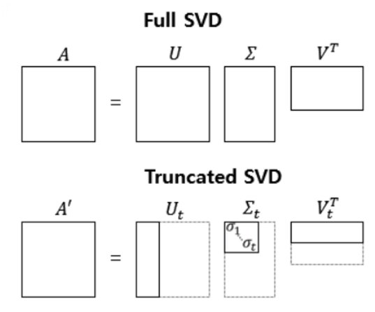 - 잠재요인 대각행렬 (S) = (M×K) 유저 행렬과 아이템 행렬을 잇는 역할로, Latent Factor의 중요도를 나타냄 (대각행렬이기 때문에 대각선 외 모두 0) → K값이 M, N인 경우: full SVD → K값이 M, N이하의 값인 경우: Truncated SVD — 일부 특이치만으로도 부분 복원 및 요약이 가능하다는 개념