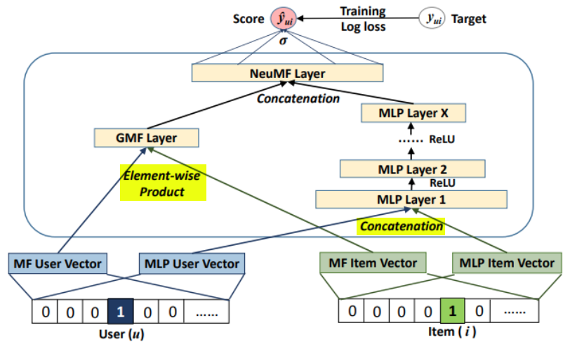 - Output Layer: 각 두 파트의 output을 conat하여 sigmoid를 통해 user와 item 사이의 관련도 0과 1사이의 값으로 예측