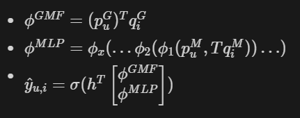 - MF를 일반화한 모델인 GMF와 MLP Part를 앙상블 (ensemble)