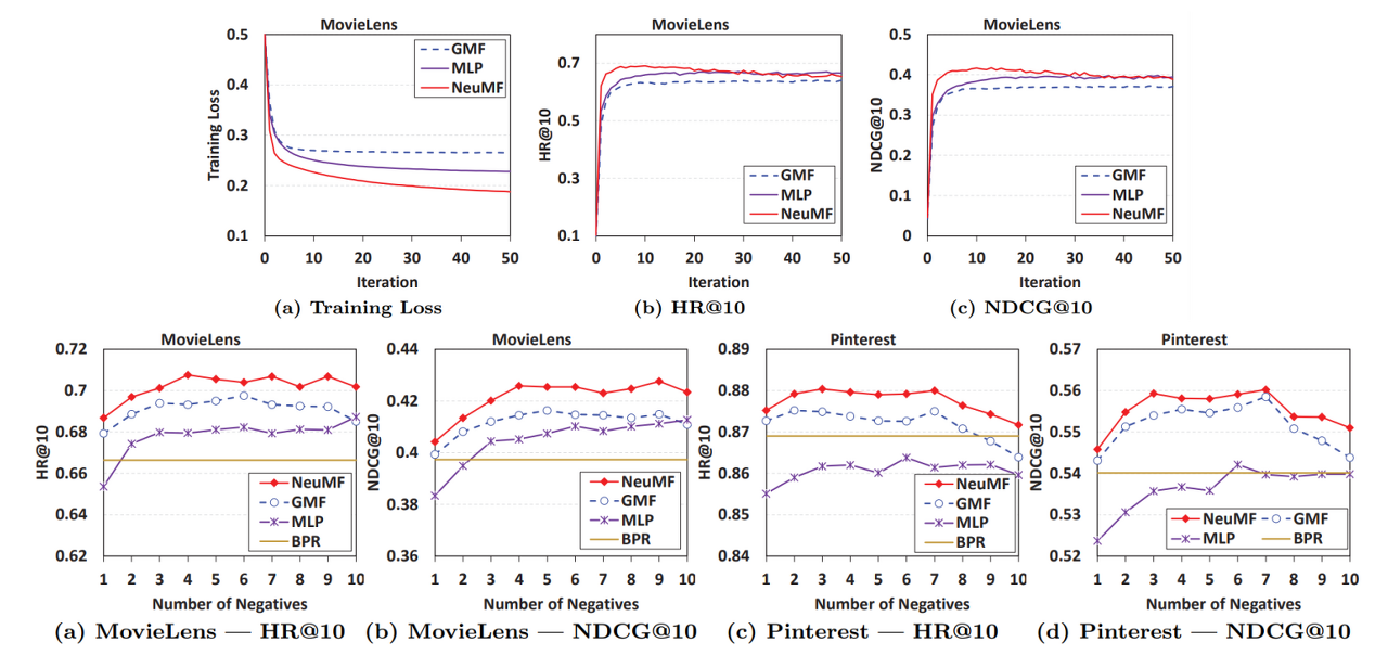 - NCF 추천 성능이 기존 MF(BPR)나 MLP모델보다 높음
