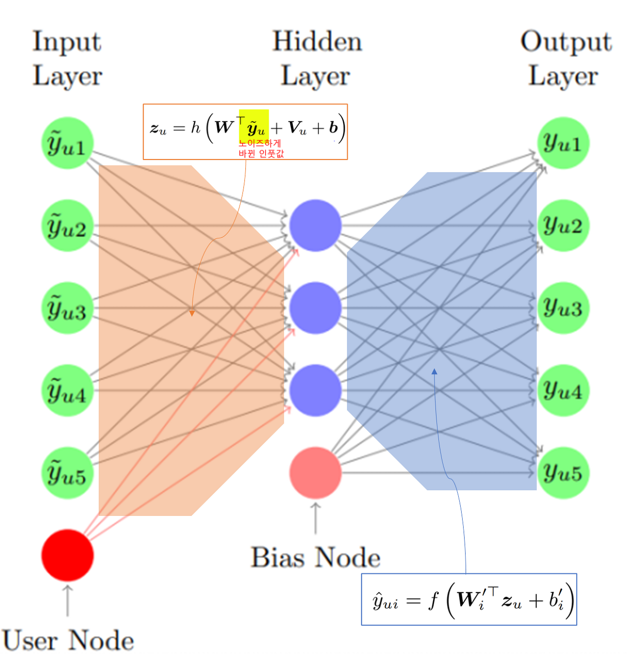 - DAE를 사용하여 확률적으로 drop-out 혹은 델타가 곱해진 노이즈된 인풋을 사용 ($y_u$는 한명의 유저 u에 대해서 모든 아이템에 대한 평점임)