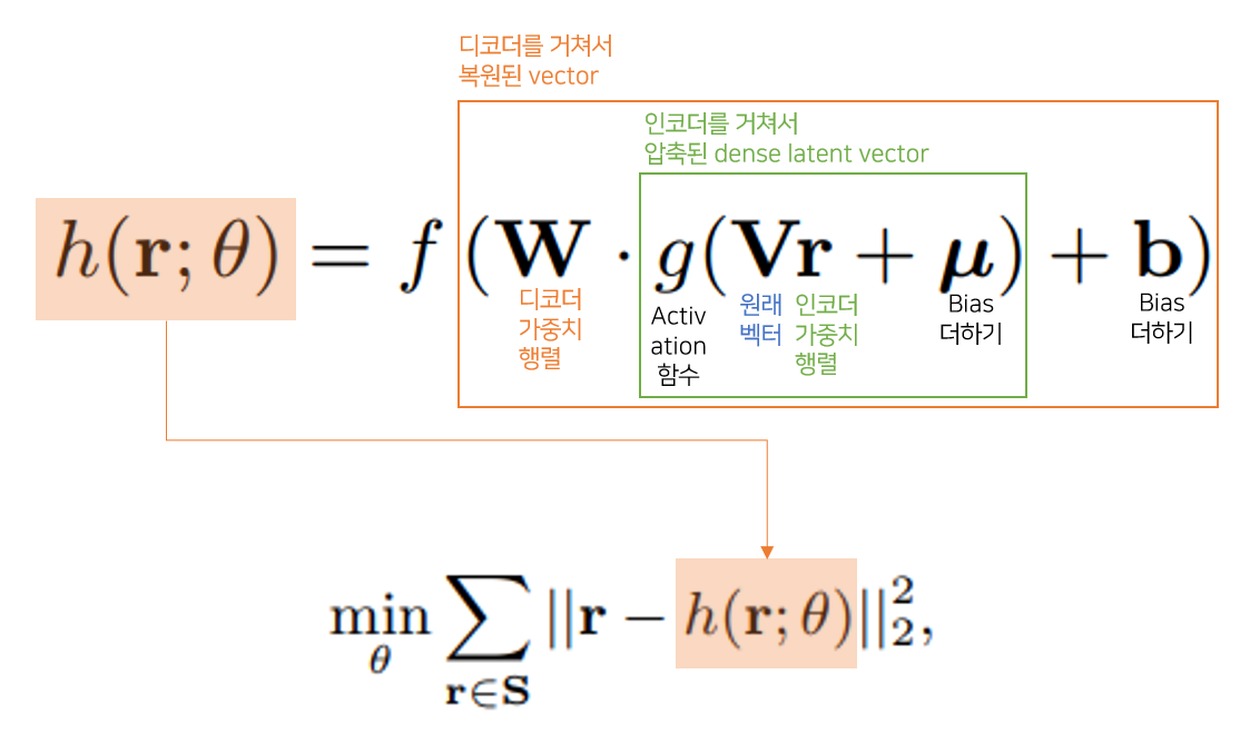 - AutoRec은 Rating Vector을 입력과 출력으로 사용하여 Encoder & Decoder 적용 → AE 기반으로 activation func을 사용해서 더 복잡한 상호작용 표현 가능