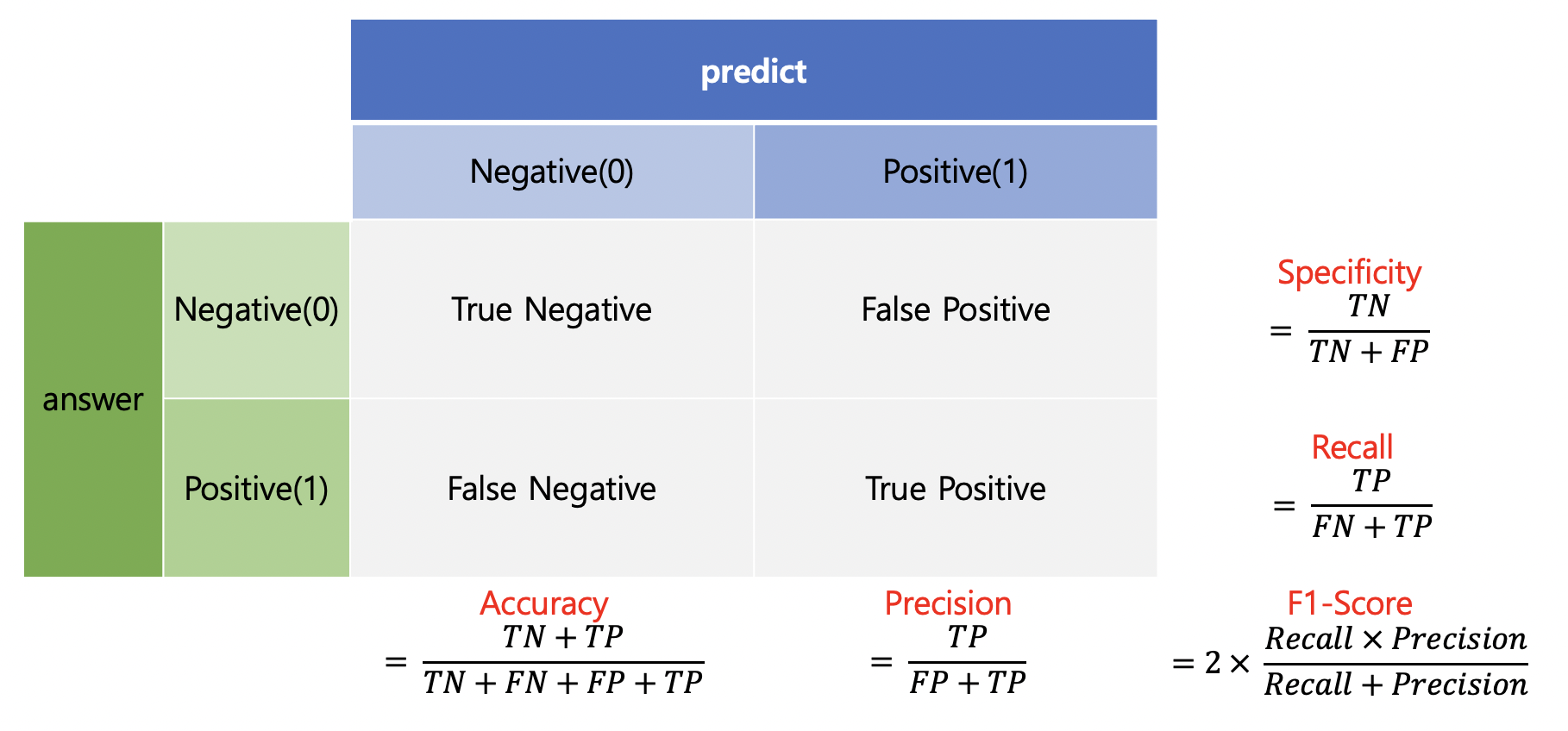 ⟶ 적게 예측할 수록 점수가 잘나옴 - recall (True Positive Rate, Sensitivity) : 진짜로 정답인 것 중에 모델이 맞춘 것