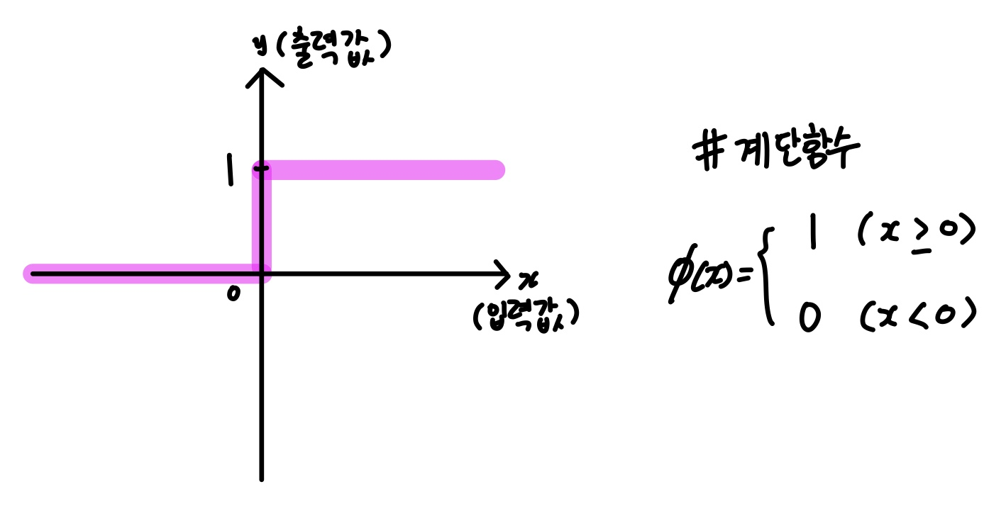 계단함수는 특정 임계값에 따라서 0 또는 1을 내뱉는 활성화 함수를 의미한다.