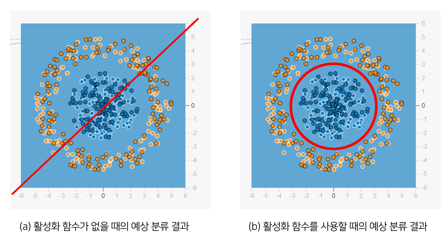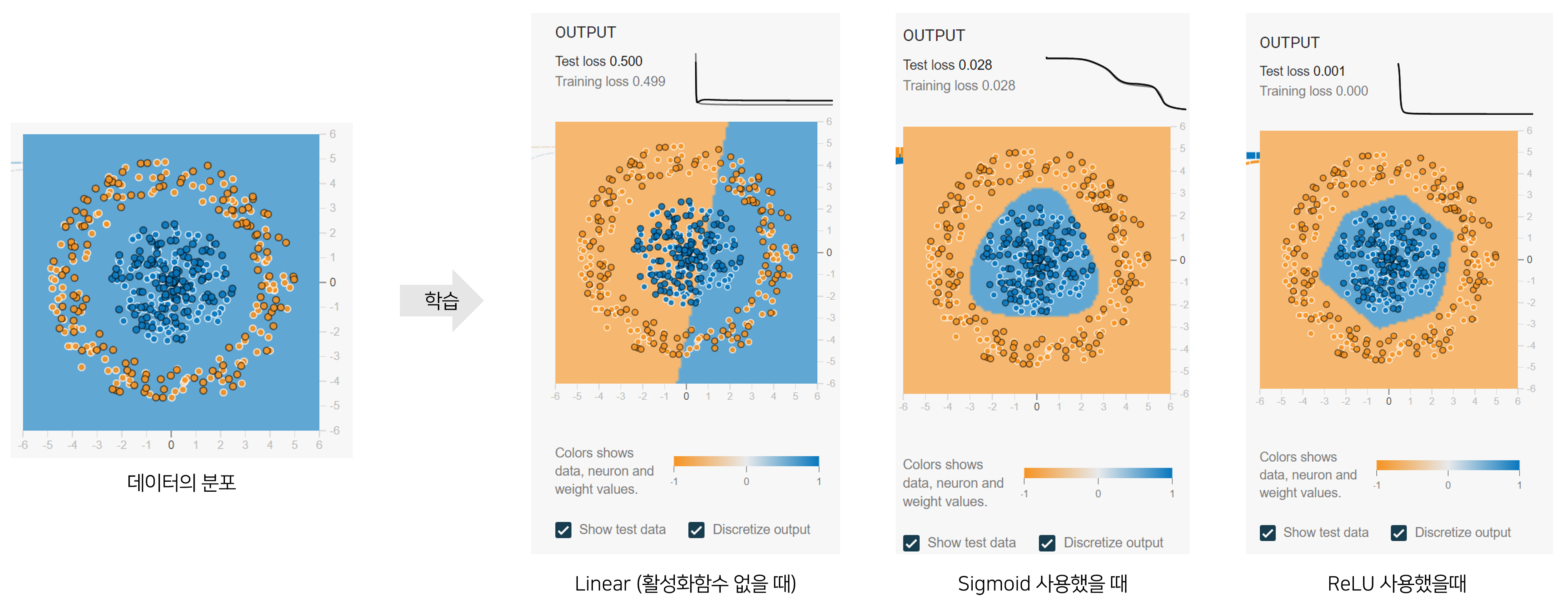앞서 위에서 언급한 데이터셋을 실제로 활성화 함수를 바꿔가며 학습했을 때, 경계가 어떻게 변화하는지 볼 수 있다 (참고 링크 중 첫 번째, 플레이그라운드 참고)