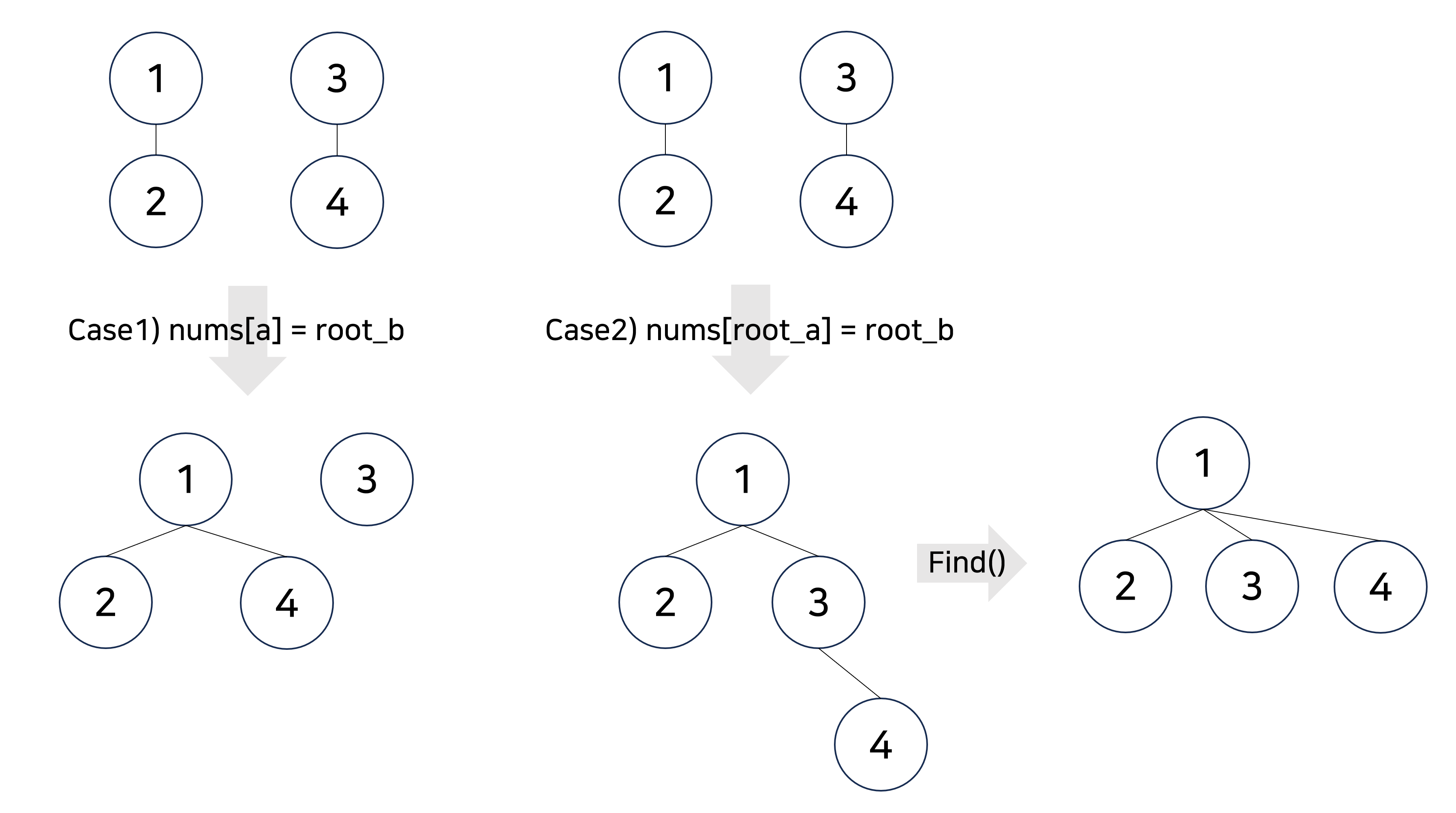- 두 노드의 루트 노드 값이 다르다면, 루트 노드 값의 크기를 비교하여 큰 수가 작은 수를 가리키도록 한다 (작은 수가 루트가 된다는 뜻