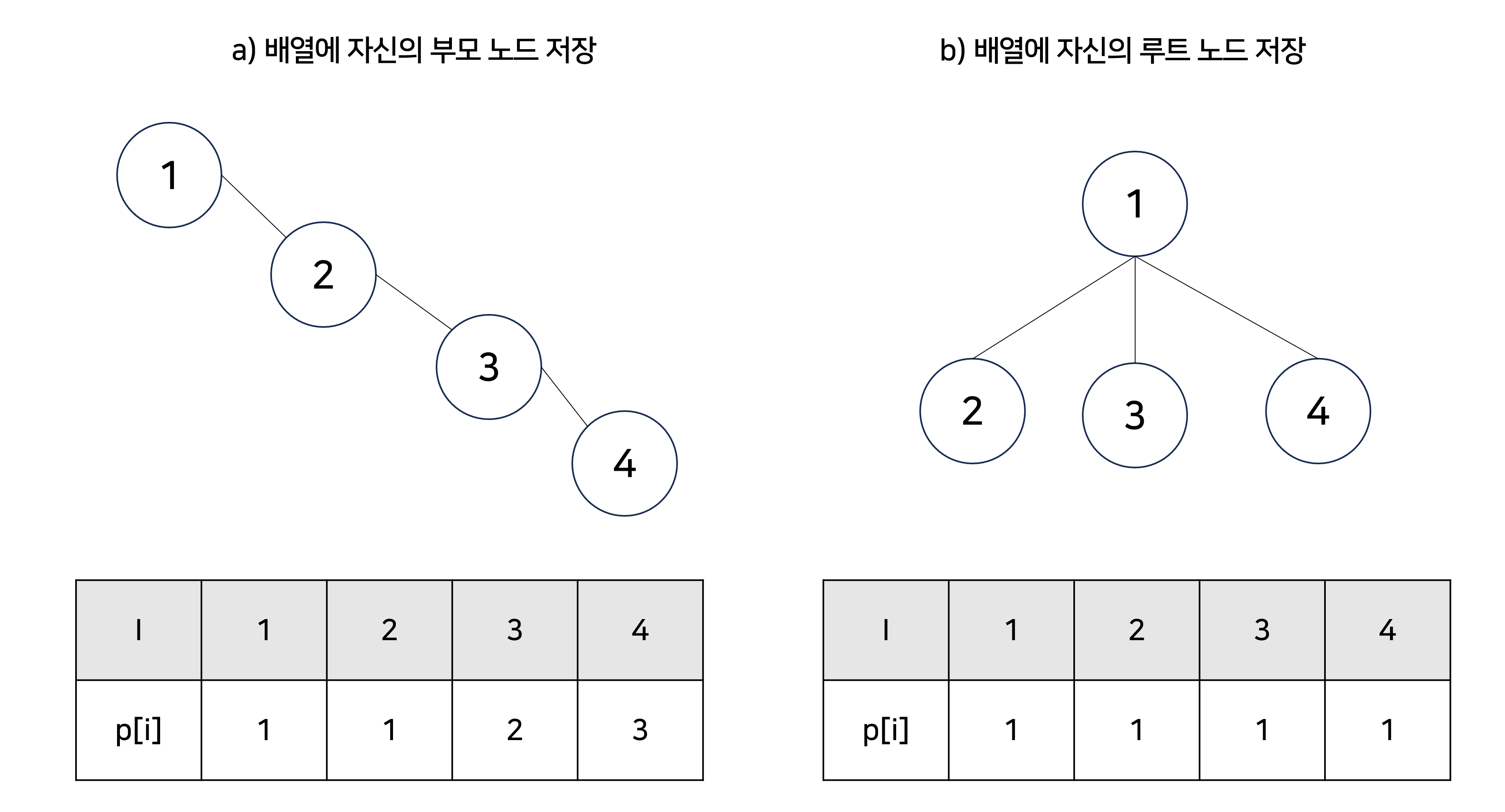 b) 각 배열에 자신의 루트 노드를 저장해놓고 이를 파인드 연산에 활용한다