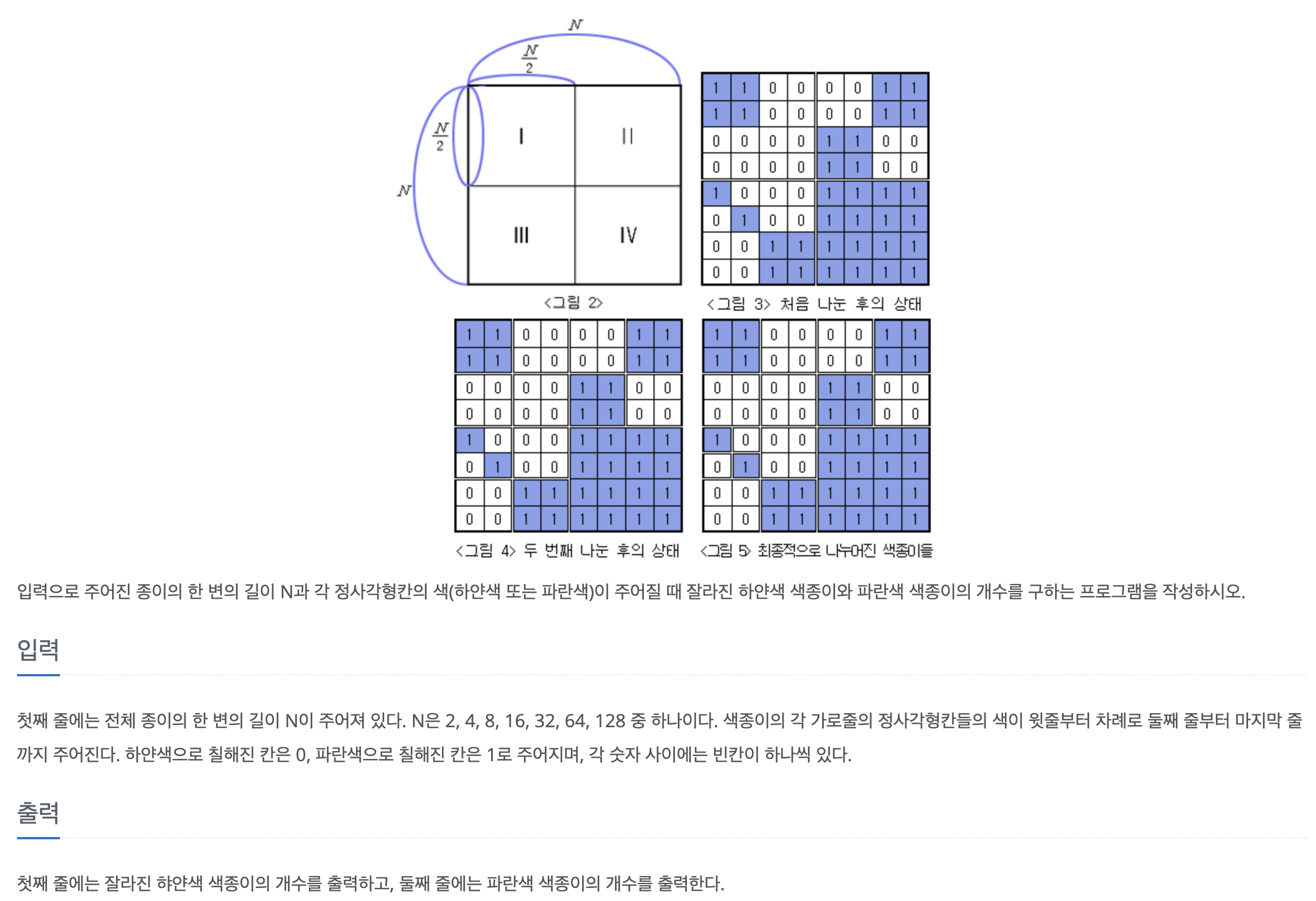 정사각형의 색종이가 있을 때, N/2를 통해서 중간 지점을 구하여 4분할을 할 수 있다