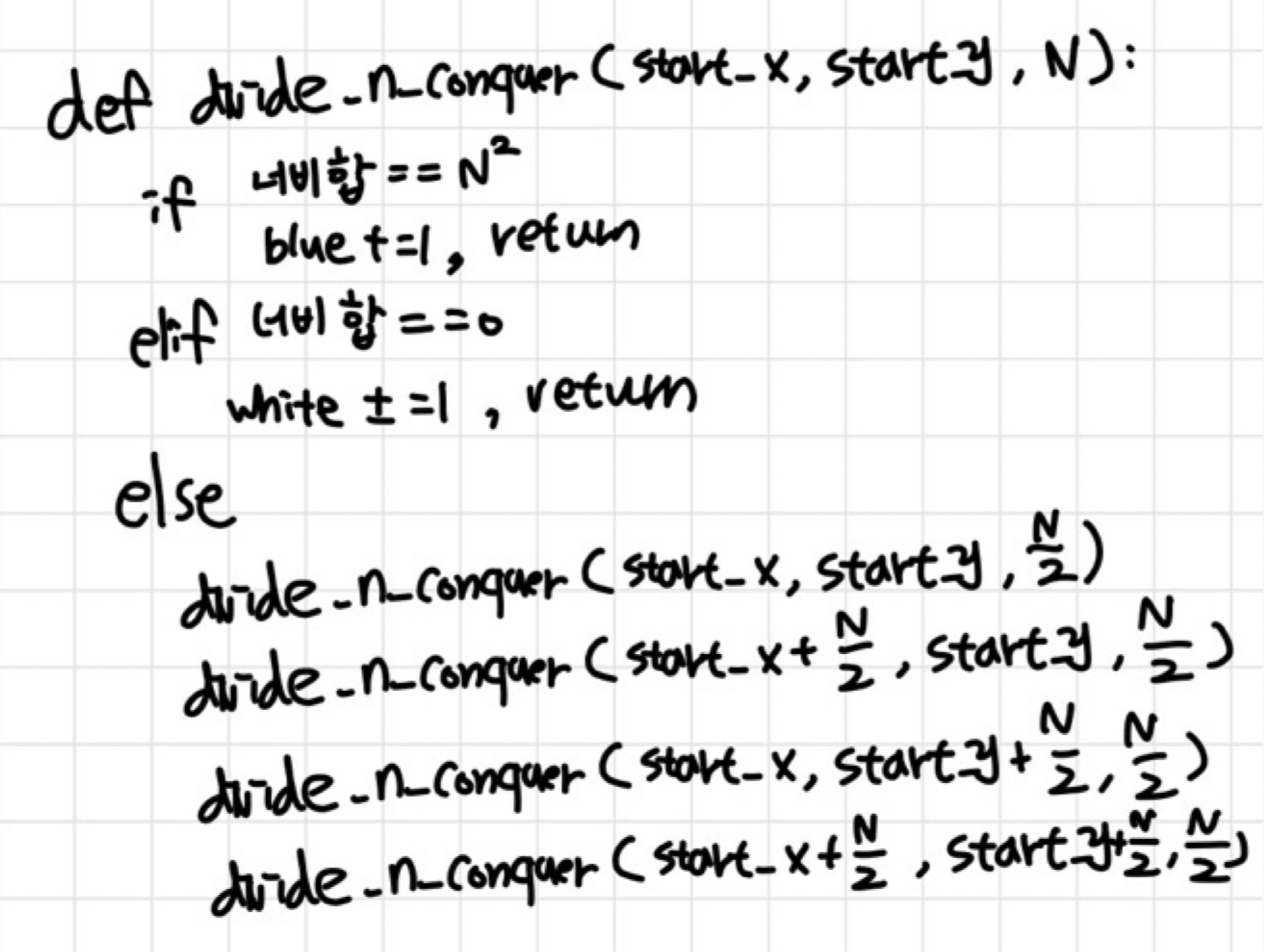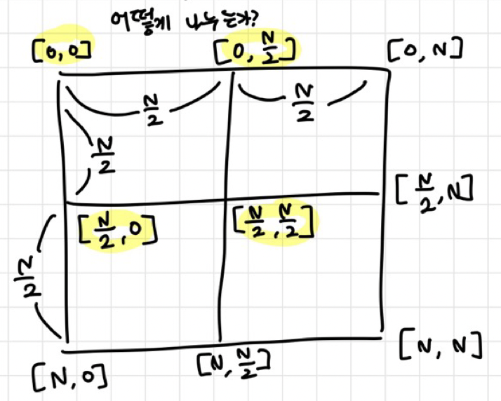 가로, 세로로 N/2씩 전진하여 영역값을 다시 탐색하면 된다 -> 재귀 호출