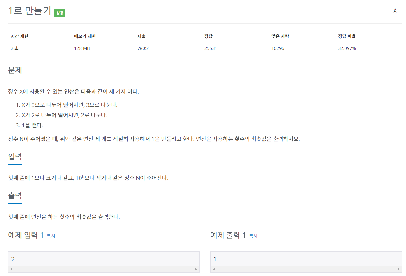 백준 코딩 알고리즘 문제 1463번 풀이 - 사용 언어: C++