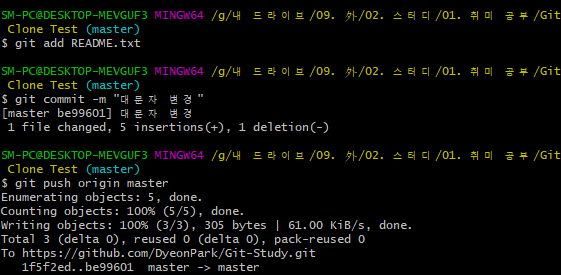 그러면 맨처음에 로컬저장소에서 커밋하여 원격저장소로 푸쉬한 것이