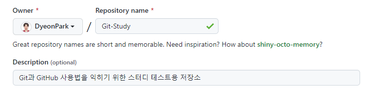 저장소 이름과 설명을 지정하여 저장소를 생성한다