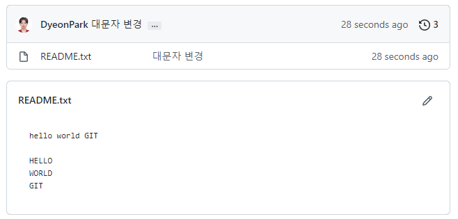 방금 푸시한대로 새로운 커밋이 올라와 README.txt 파일의 내용도 변경된 것을 확인할 수 있다