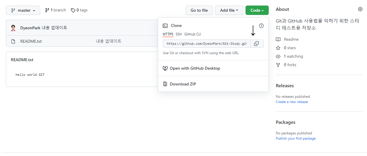 방금 푸시한대로 새로운 커밋이 올라와 README.txt 파일의 내용도 변경된 것을 확인할 수 있다