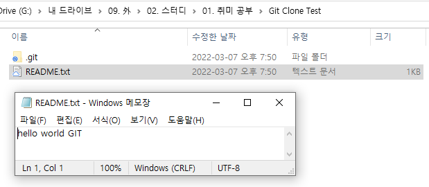 Git Study 폴더에서 다시 README.txt 파일을 열어보면