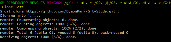 git clone 명령어 뒤에 원격저장소 주소를 붙여넣고