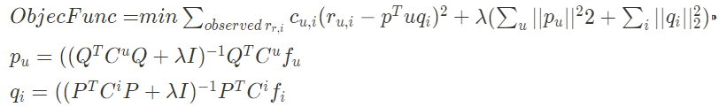 - 암시적 데이터의 내적값이 0 또는 1로 나오는데, 실제값과 내적값의 차이를 얼마나 반영할지를 confidence와의 곱으로 조절하도록 함