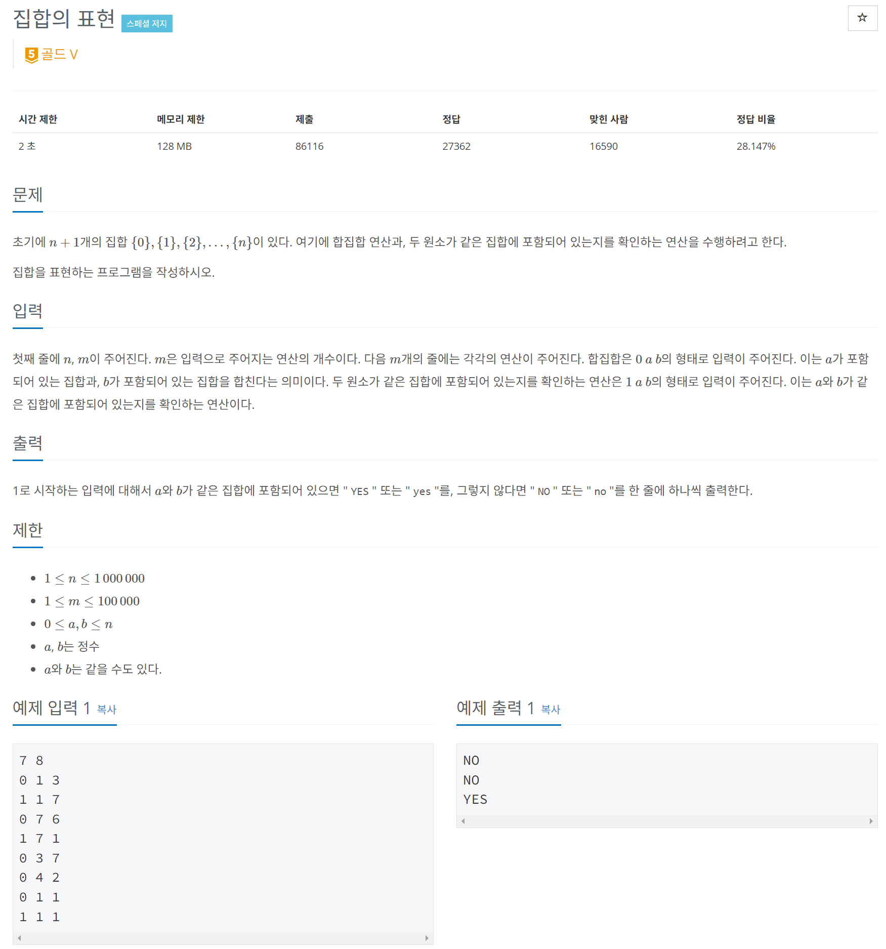 - 두 루트 노드 값을 비교하여 같은 집합인지 여부를 반환한다