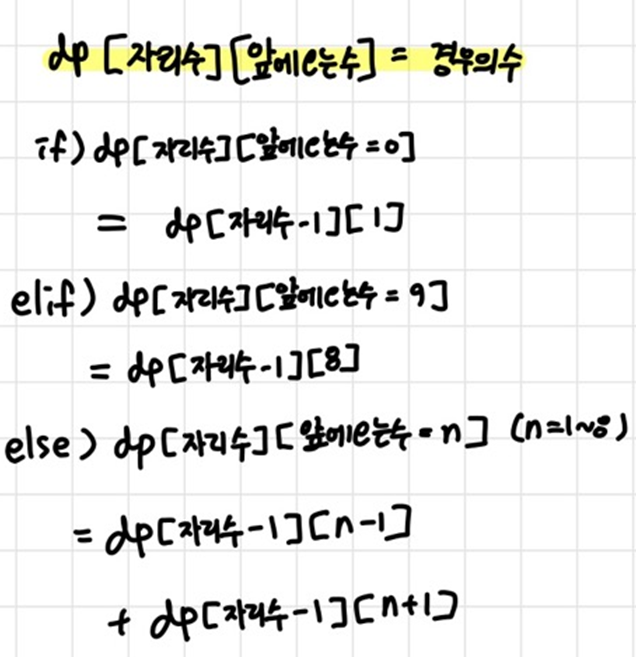 우선 초기값으로 한 자리수일 때 1~9까지 값에 대하여 모두 1의 경우의 수 값을 저장해준다