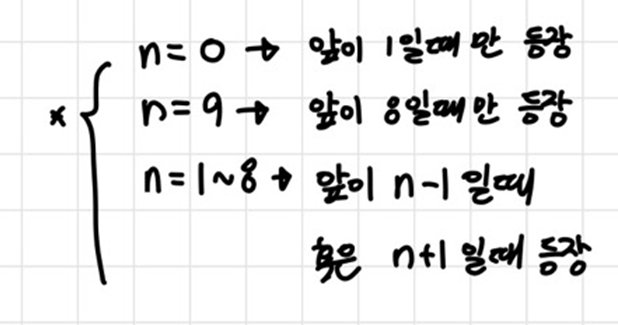 그 외 현재 자릿수 값이 n (n=1~8)이라면, 앞의 자릿수가 n-1일 때 혹은 n+1일때 등장할 수 있다